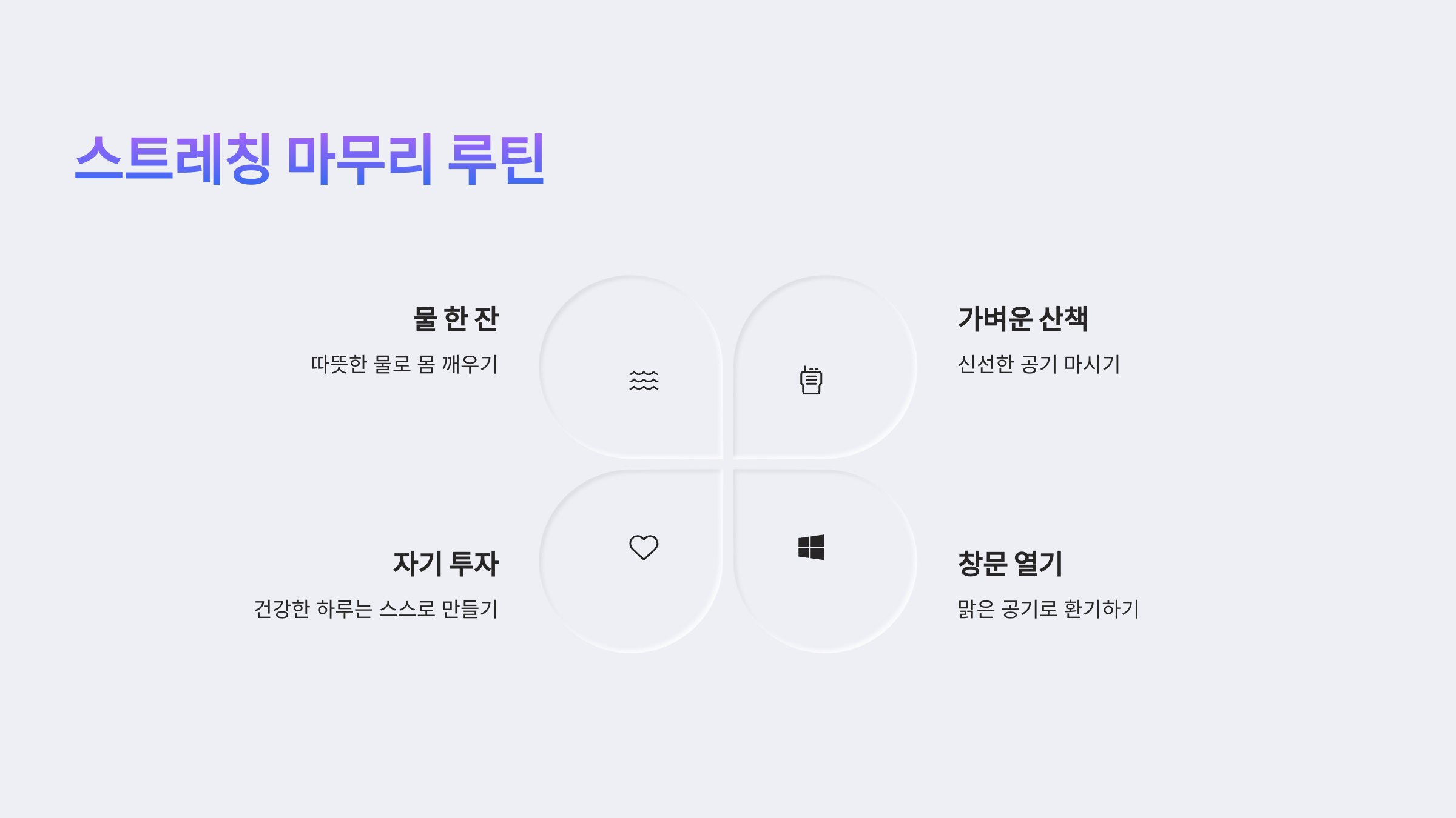 스트레칭이 끝난 후엔 따뜻한 물 한 잔으로 몸을 깨워주세요. 그리고 가벼운 산책이나 창문을 열고 신선한 공기를 마시면서 모닝 루틴을 마무리하면 하루 종일 컨디션이 좋아집니다.