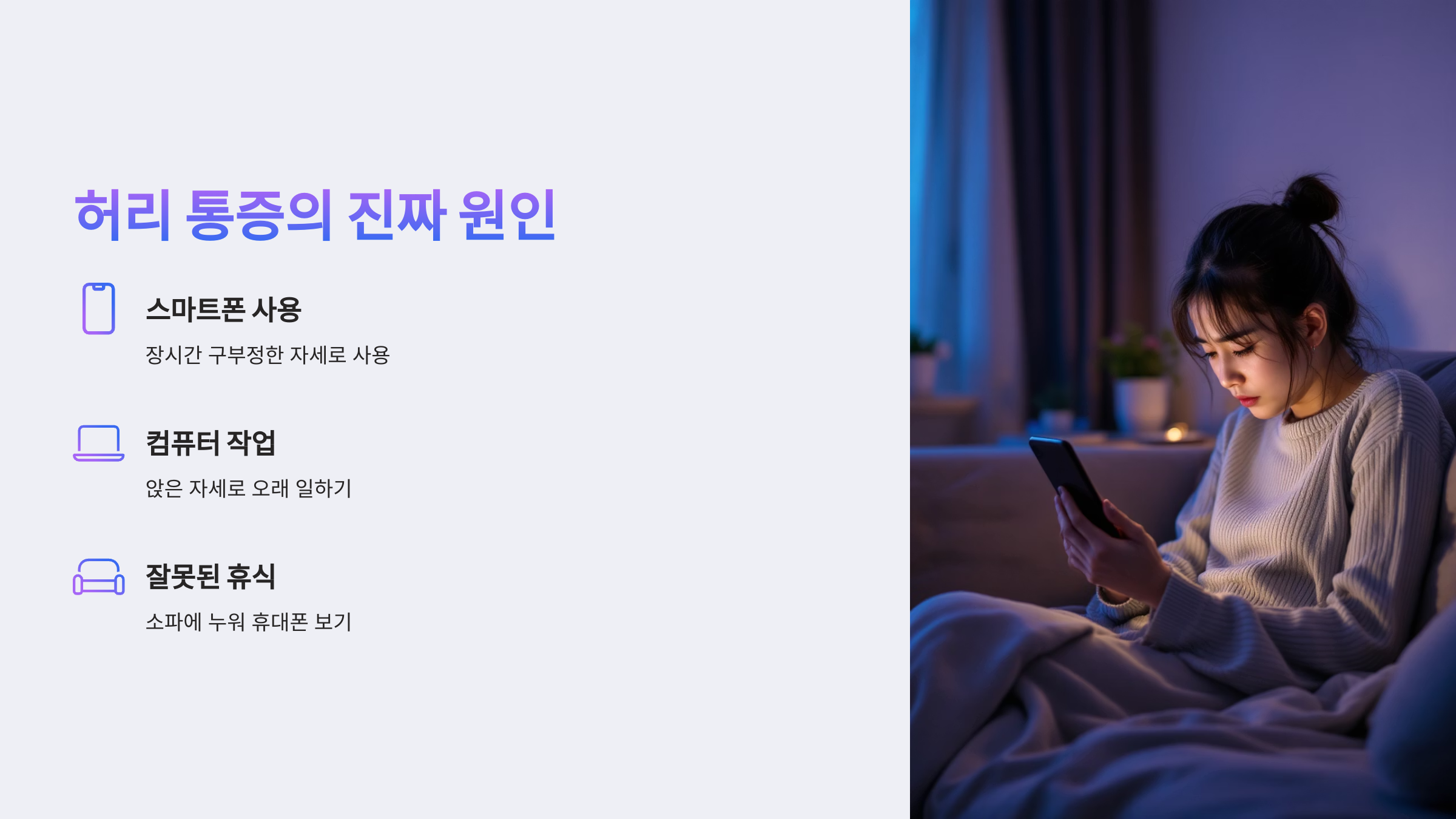 요즘 현대인의 생활 패턴을 떠올려보면, 하루 대부분을 스마트폰과 노트북 앞에서 보내고 있지 않나요? 장시간 앉아서 구부정한 자세로 일하거나, 소파에 누워 스마트폰을 오래 보는 습관 등은 모두 허리에 치명적이에요.