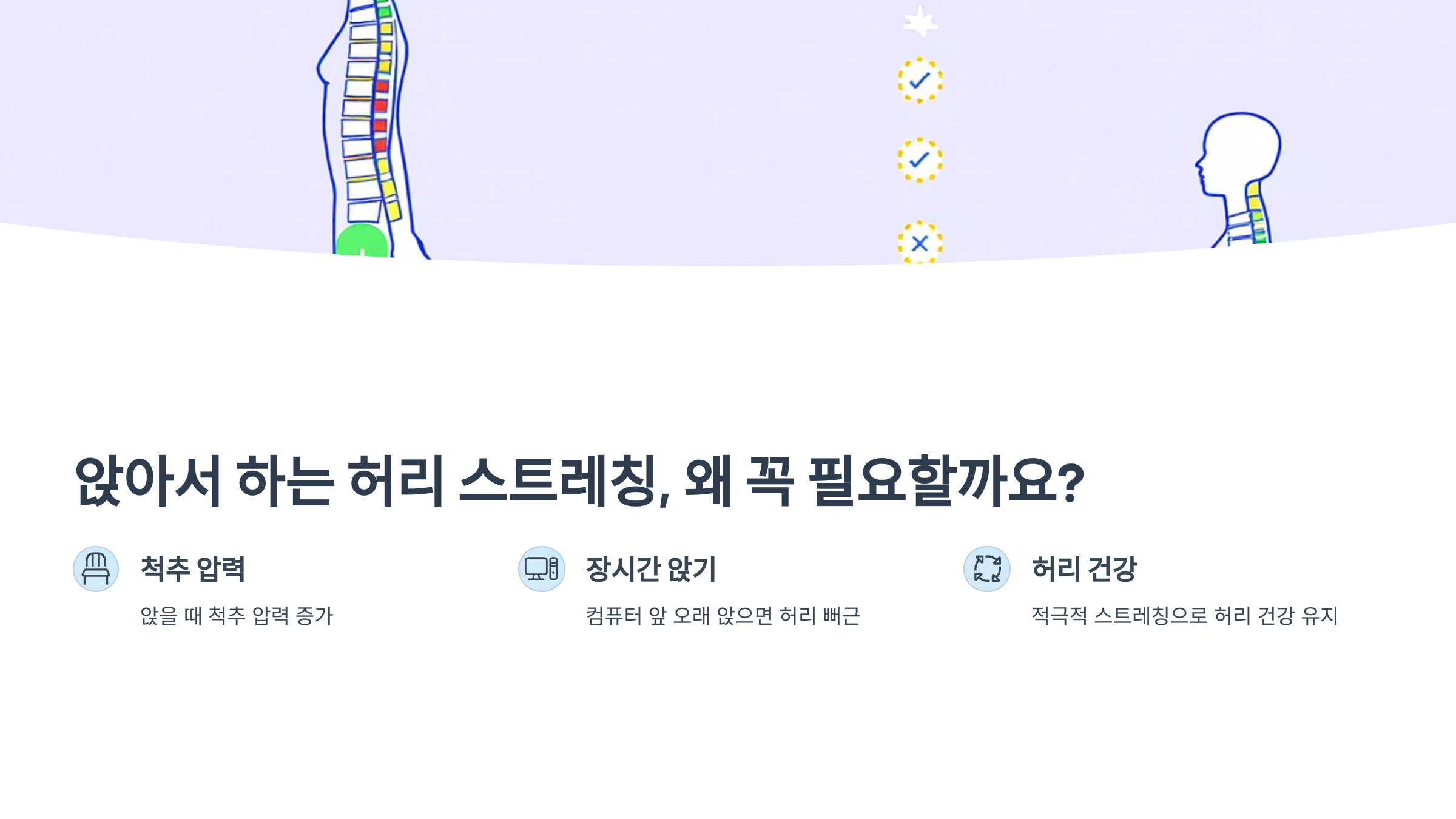 특히 앉아 있을 때는 척추에 가해지는 압력이 서 있을 때보다 더 크다고 해요! 그러니 앉아 있는 시간엔 오히려 더 적극적으로 스트레칭을 해줘야 허리 건강을 지킬 수 있습니다.