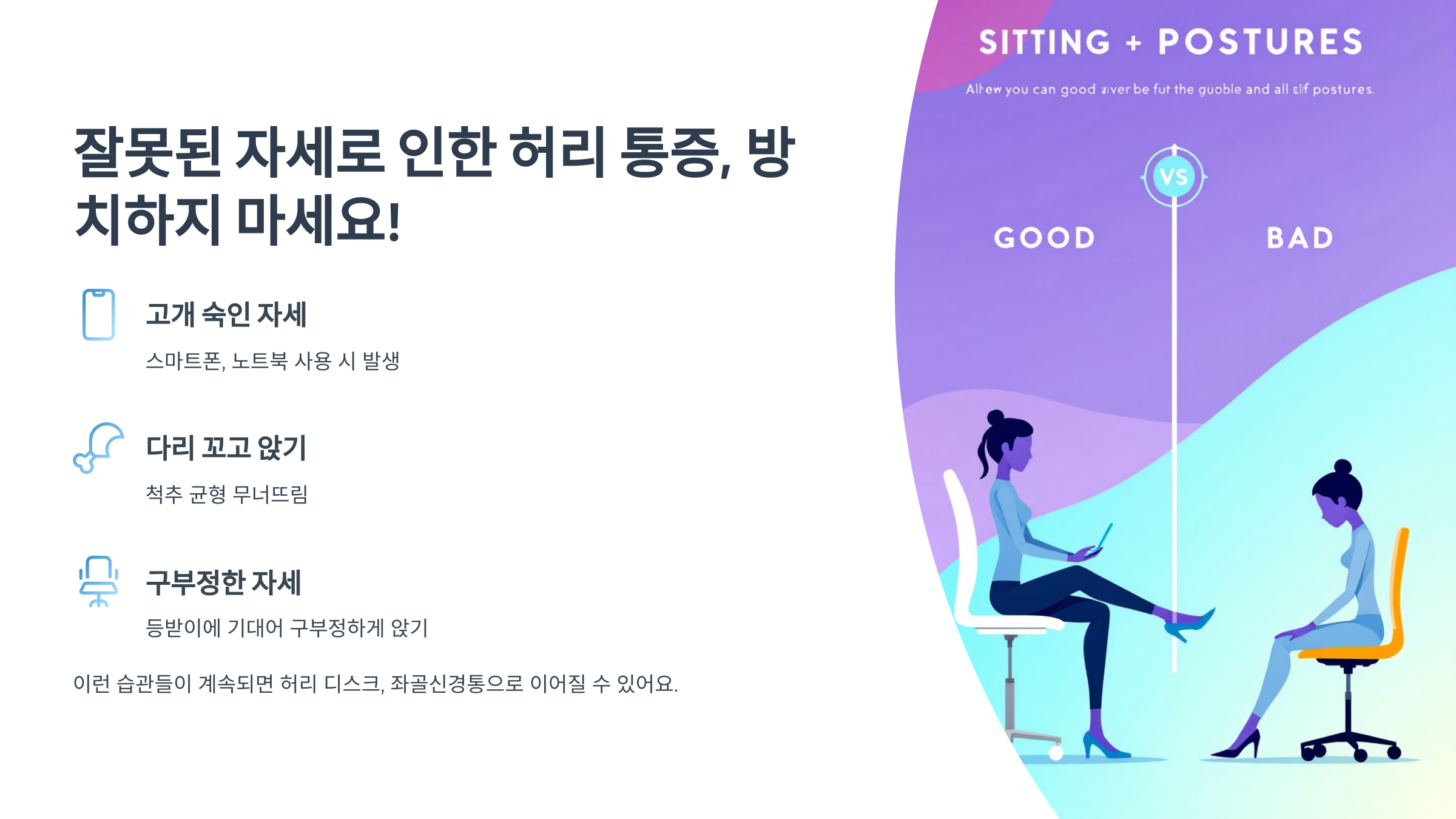 이런 자세, 무심코 반복하고 계시진 않나요? 이런 습관들이 계속되면 허리 디스크, 좌골신경통 같은 큰 병으로 이어질 수도 있어요.