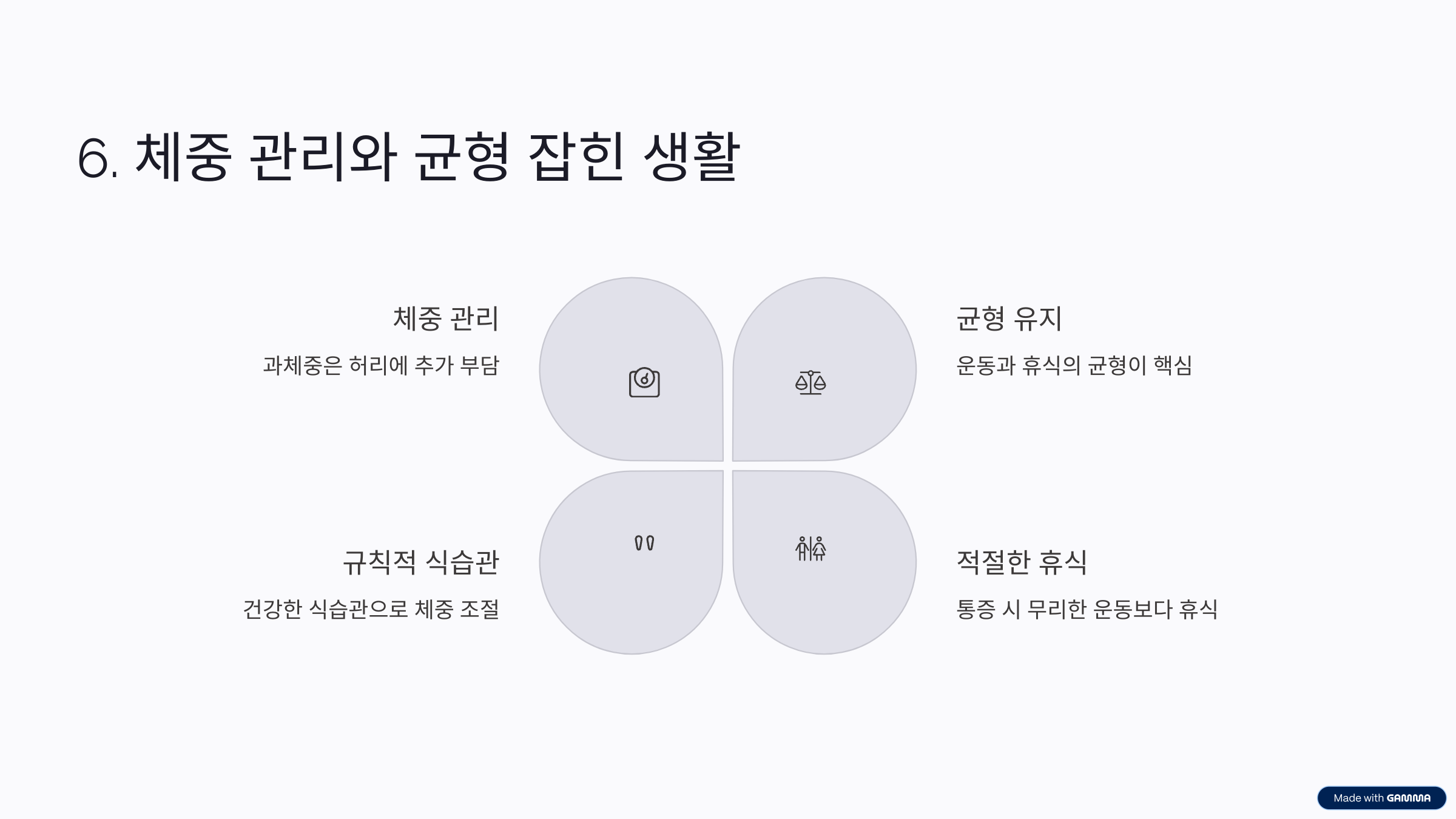 조금씩 실천하다 보면 어느새 체중도 줄고, 허리 통증도 눈에 띄게 감소하는 걸 느낄 수 있을 거예요!