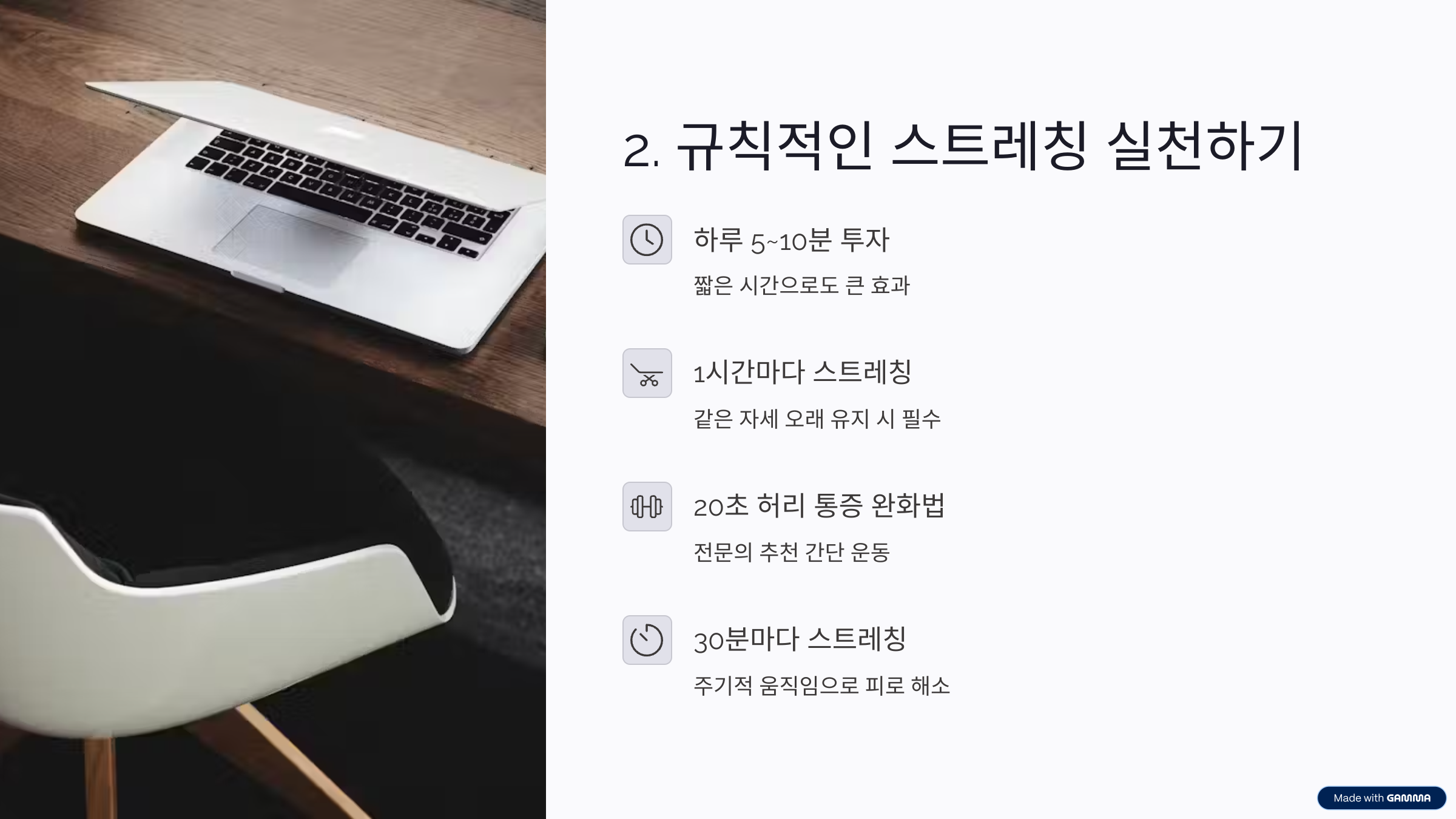 저도 사무실에서 1시간에 한 번씩 자리에서 일어나 간단한 스트레칭을 하고 나면 몸이 한결 가벼워지더라고요! 😊