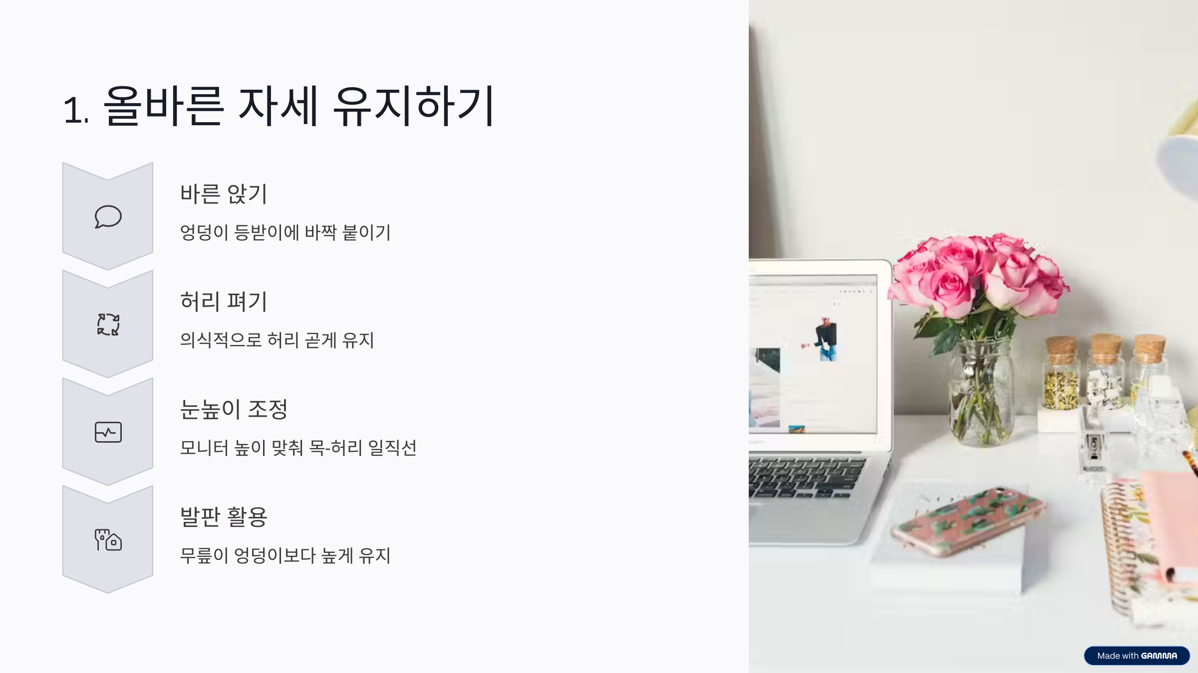 - 자주 거울로 자신의 자세를 체크해보는 것도 큰 도움이 됩니다!