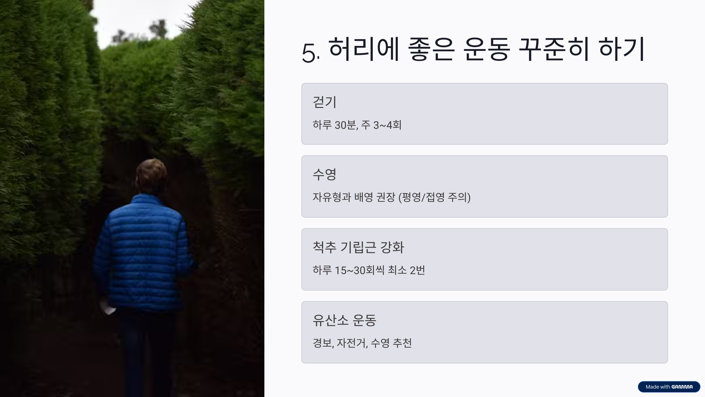 운동은 허리를 지탱하는 근육을 강화해주는 최고의 방법이에요! 🏋️♀️ 허리가 약해지면 작은 충격에도 쉽게 통증이 생기기 때문에, 평소 코어 근육을 강화하는 운동을 추천해요.