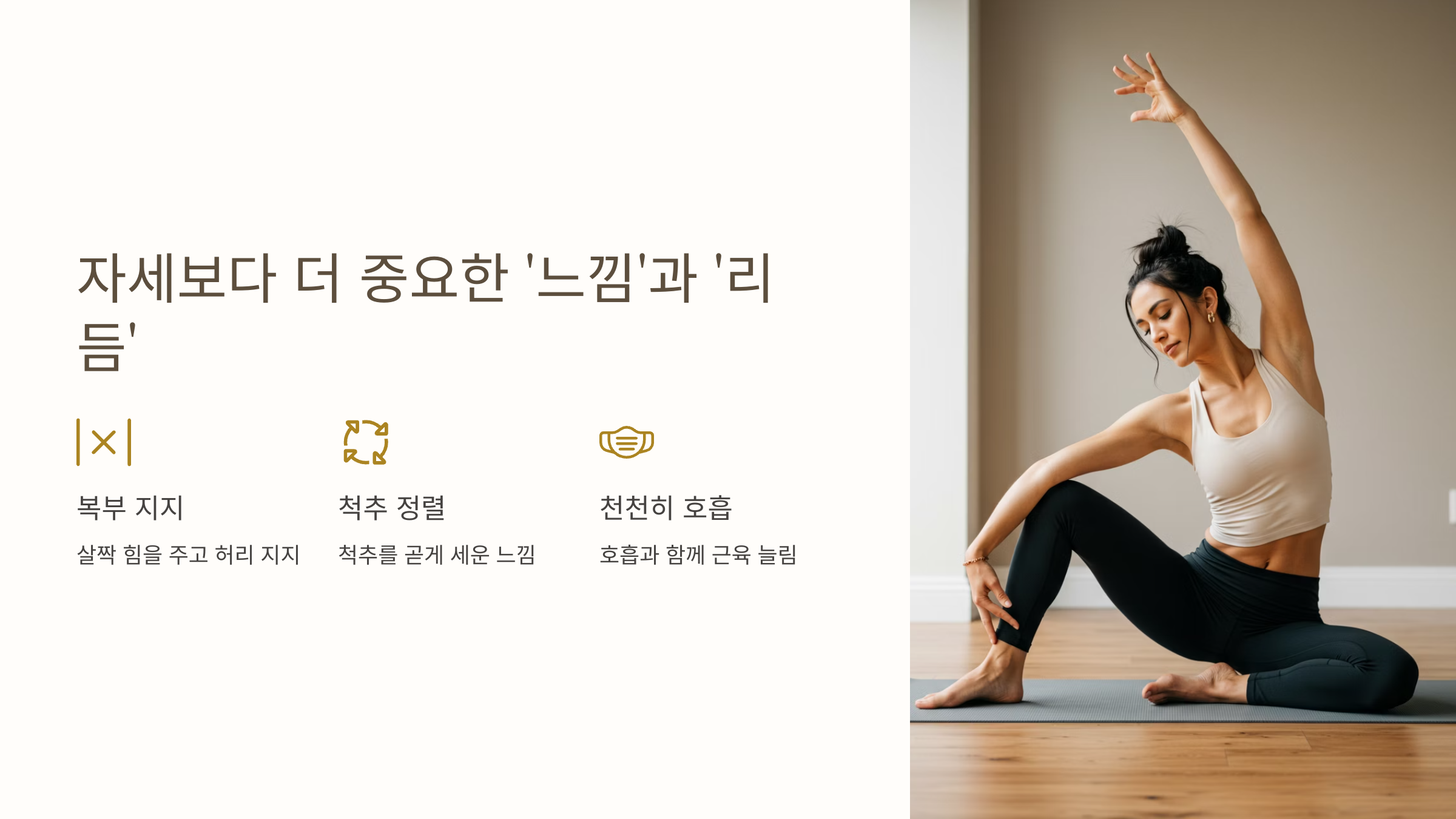 근육이 “늘어난다”는 감각에 집중해 보세요. 그 느낌이 바로 당신의 허리가 건강해지는 증거입니다.