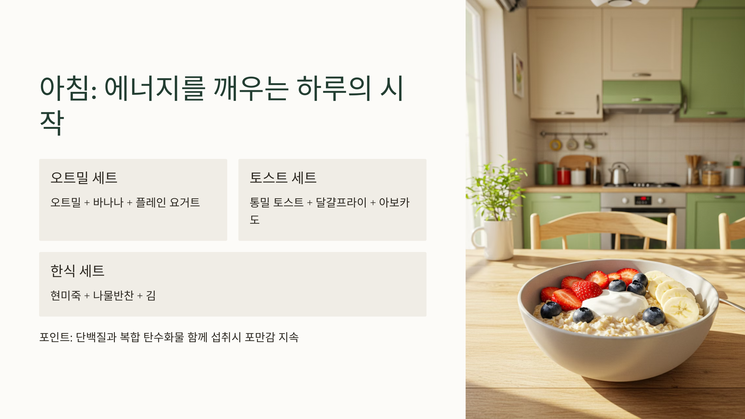 ※ 포인트: 단백질과 복합 탄수화물을 함께 섭취하면 포만감이 오래갑니다.