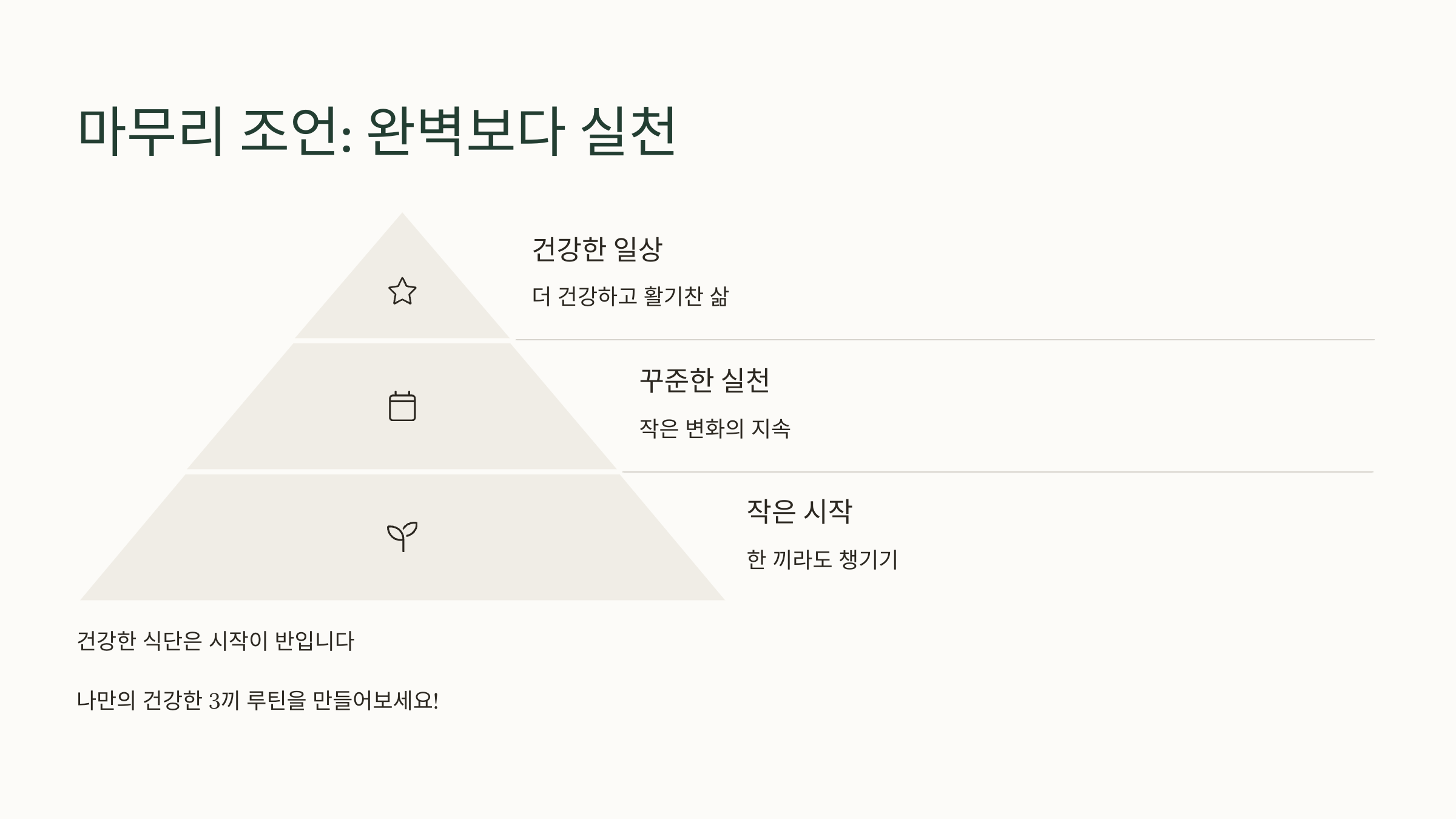 건강한 식단은 시작이 반입니다. 처음부터 모든 끼니를 완벽하게 구성하려 하지 말고, 하나씩 실천해보세요.